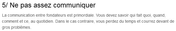 Note : Une simple action réalisée sans communiquer, dans le dos de l’un de ses partenaires / associés et les conséquences risquent d’être terribles. Pour garder la confiance indispensable à la réussite du projet, il vaut échanger au maximum et valider ensemble. Si la confiance disparait suite à un « coup bas », c’est la fin de projet.