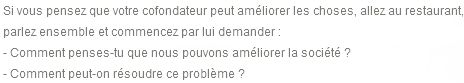 Note : Sans remise en question, que cela soit des conflits entre fondateurs ou au sein de n’importe quelques formes de travail collaboratif, il n’est possible de régler aucun problème.